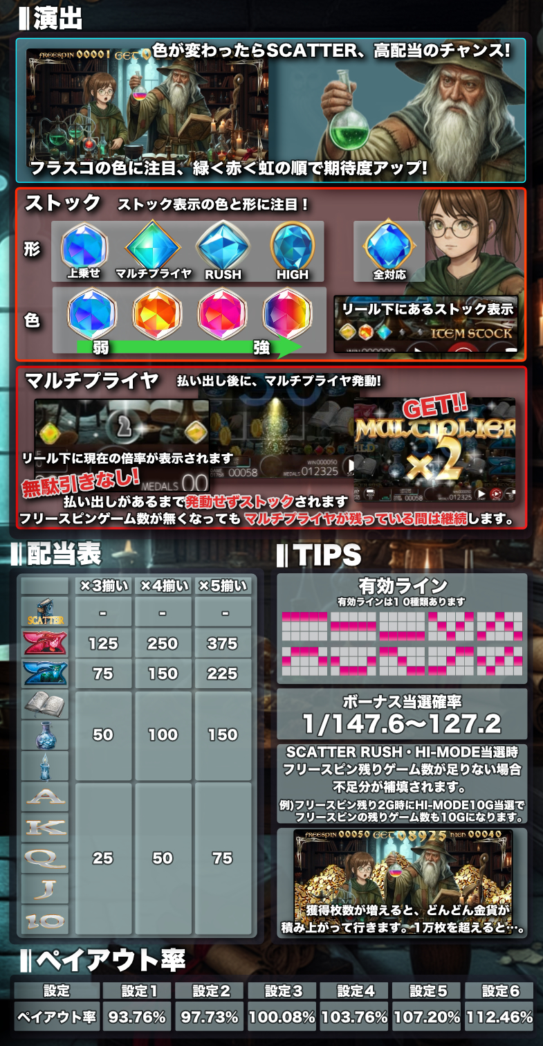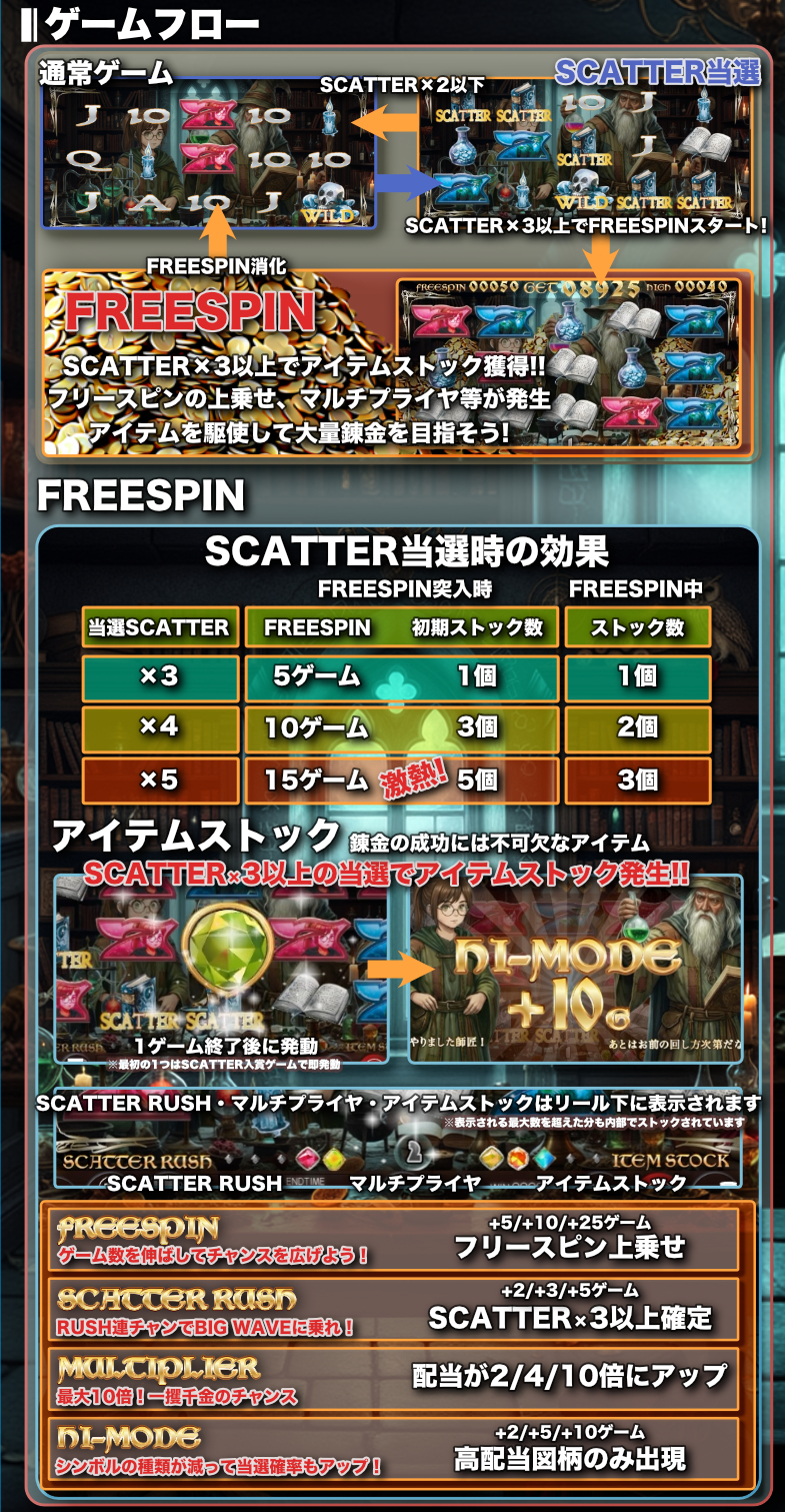 アリスタウン のスロットは、コンピューターと対戦する1人用ゲームです。 1ラインスロット「GOLD ALCHEMIST」では、1回にゲーム起動前に選択したBET数迄でスロットメダルをベットすることができ、払出ルール等から払出しを受けることが出来ます。