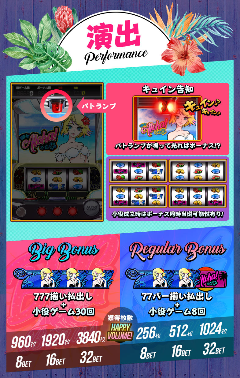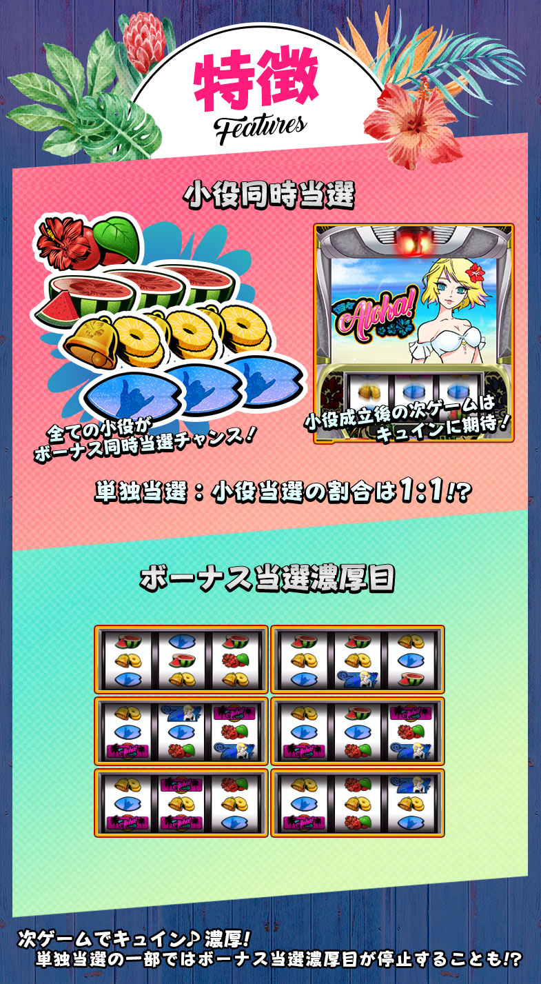 8ラインスロット「遊々アロハ!Reel Stop Slot」はMAXベット専用機です(MAXベットはバトルエリアの場合5ポイントのみとなります。トレジャーエリアの場合は5枚/10枚/20枚の3種類の台からお選び頂けます)。